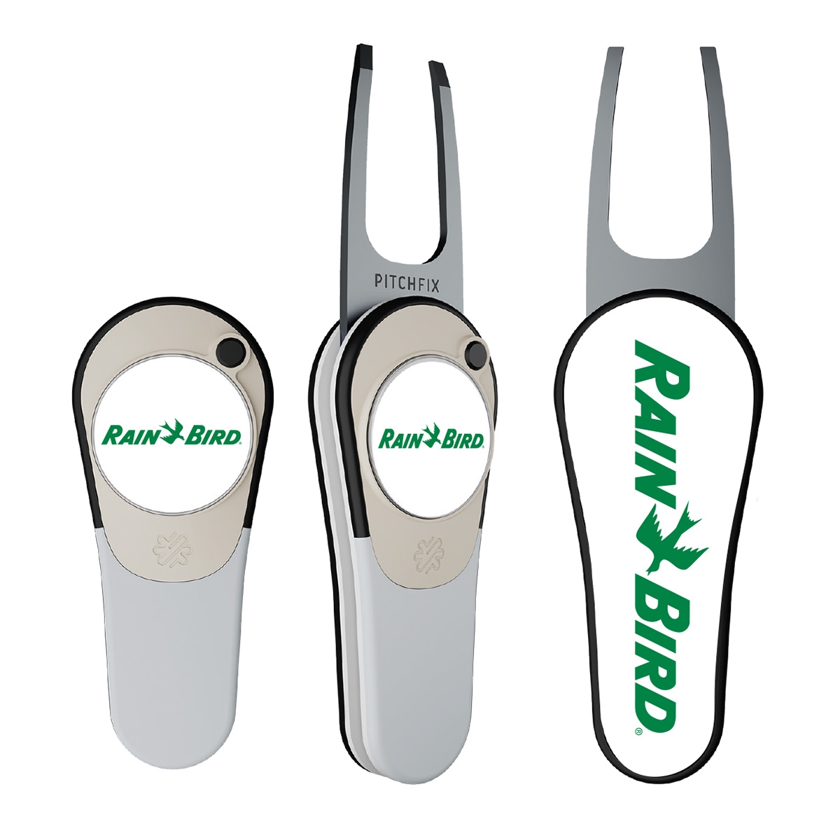 Features ergonomic handle, switchblade divot forks and an integrated club rest. Size: 3"" x 1.25"" Rain Bird logo imprinted on ball marker and on back of tool.
